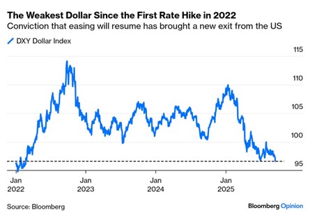 The dollar dropped this week to its lowest level since the start of the Fed’s 2022 rate-hike cycle. This is what President Donald Trump’s administration wants and eases financial conditions for anyone around the world who needs to finance in dollars. Source: Bloomberg.