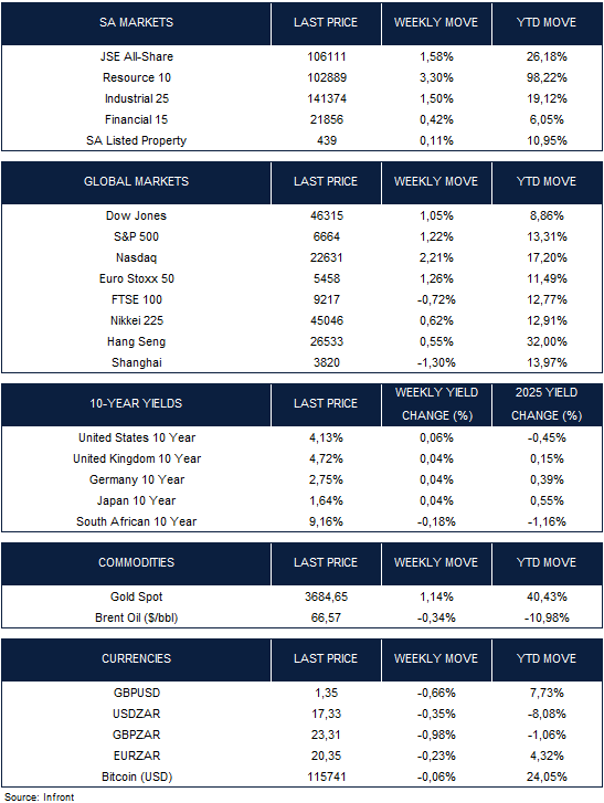 The All-Share Index rose 1.58% last  week, boosted by Resources and Industrials. The local currency strengthened against the U.S. dollar, moving to R17.33/$ from the previous week’s R17.39/$ level. The 10-year SA government bond extended its year-to-date rally, with yields falling 18 basis points over the week.