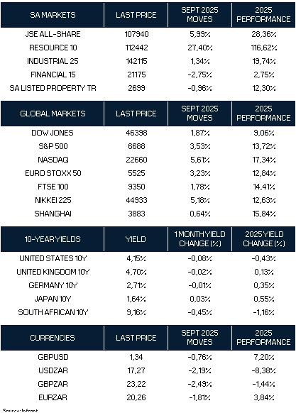 The JSE gained nearly 6% in September, but performance was highly uneven. Resources soared over 27% as precious metals surged, while industrials posted only modest gains and financials and property declined.
