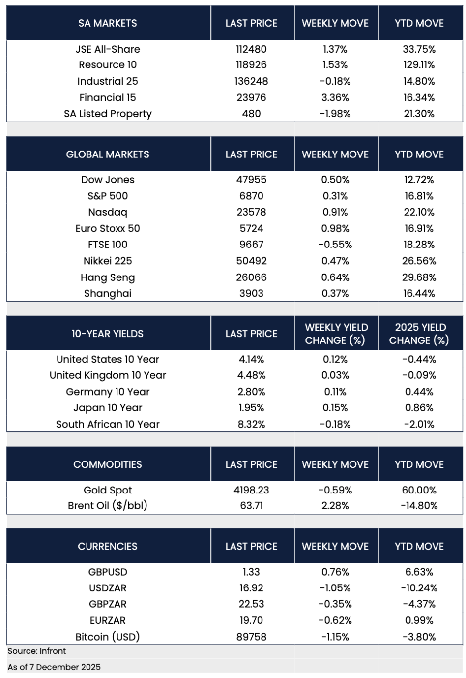 Local shares had a good week. The JSE All Share Index rose 1.37%. Resource stocks gained 1.53%, helped by the rand and commodity moves, while financial shares climbed 3.36% as banks and insurers benefited from a stronger rand and lower bond yields. Industrial shares were slightly weaker, falling 0.18%, and listed property gave back 1.98% after a strong run, as investors took some profits and remained cautious on the local growth outlook.