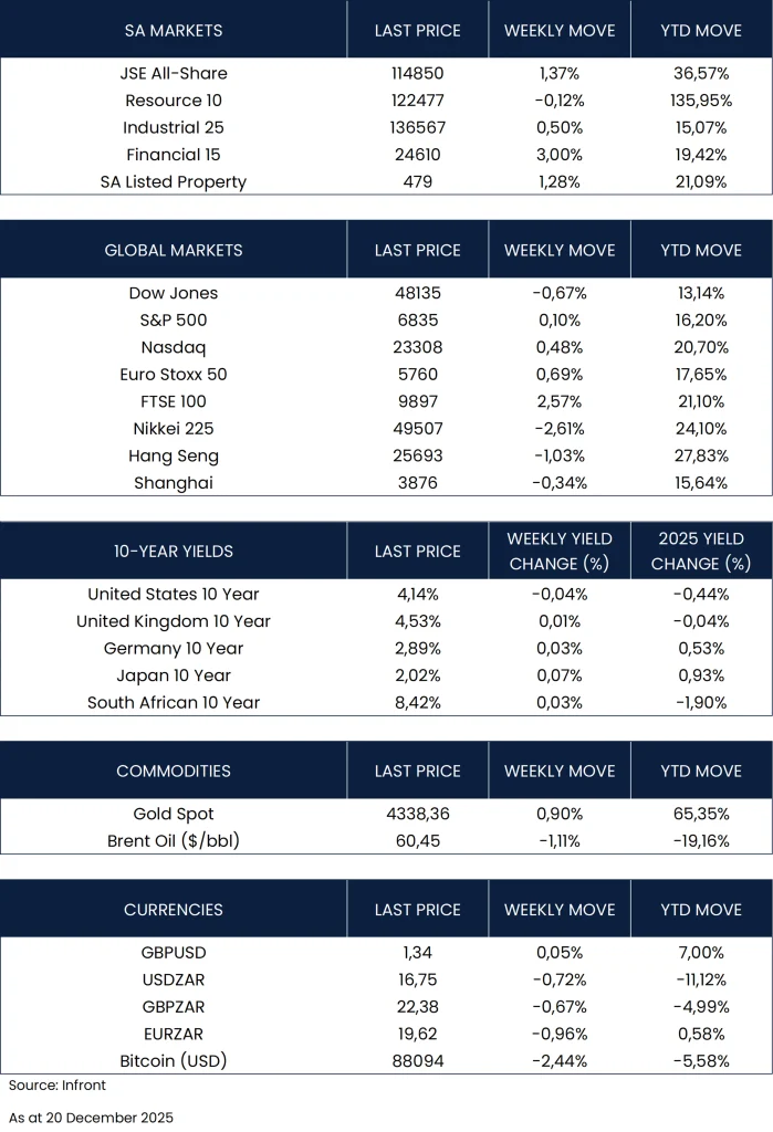 The JSE All-Share Index advanced 1.37% over the week, supported by a strong 3.00% gain in the financial sector. The industrials and property sectors posted modest gains of 0.50% and 1.28%, respectively, while the resource sector marginally declined by 0.12%. Meanwhile, the rand strengthened modestly, appreciating 0.72% against the U.S. dollar to close at R16.75 on Friday.