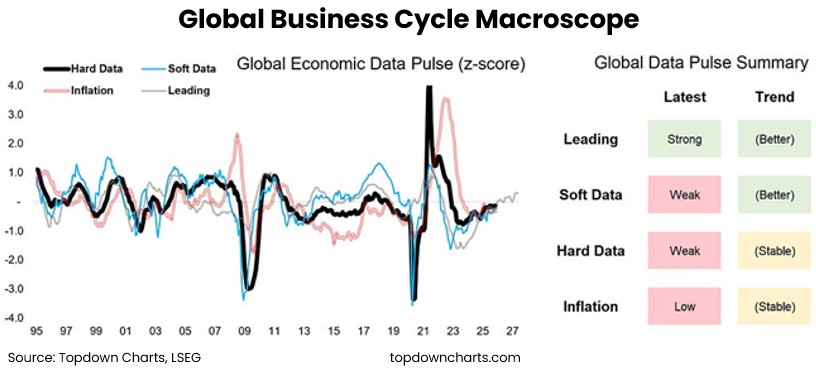 December capped a strong year across asset classes, but elevated valuations and relatively complacent sentiment into 2026 underscore the importance of disciplined asset allocation and risk management. As global monetary policy shifts from a headwind to a tailwind, with central banks easing amid contained inflation, the macro-outlook is best characterised by a balance between downside growth risks and the potential for renewed momentum, with the U.S. facing mixed late-cycle signals while Japan, Europe and China show signs of improving growth supported by policy stimulus. Source: Topdown Charts.
