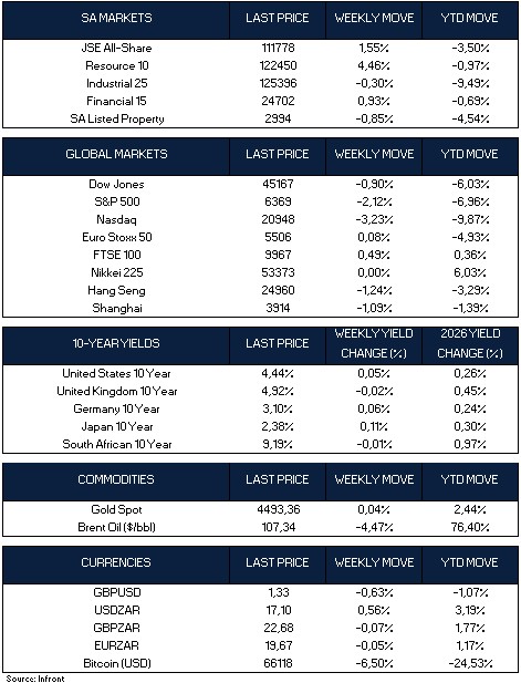 Against this backdrop, South African markets ended the last week firmer, diverging from the weaker tone seen across several major global equity markets. The JSE All Share Index gained 1.55%, supported primarily by a strong rebound in resource shares, while financials also posted a solid gain. Industrials were marginally weaker, and listed property softened modestly. Despite the weekly improvement, year-to-date performance remains mixed, with most major sectors still in negative territory. The rand softened modestly to R17.10 against the US dollar, while the South African 10-year government bond yield edged slightly lower to 9.19%.