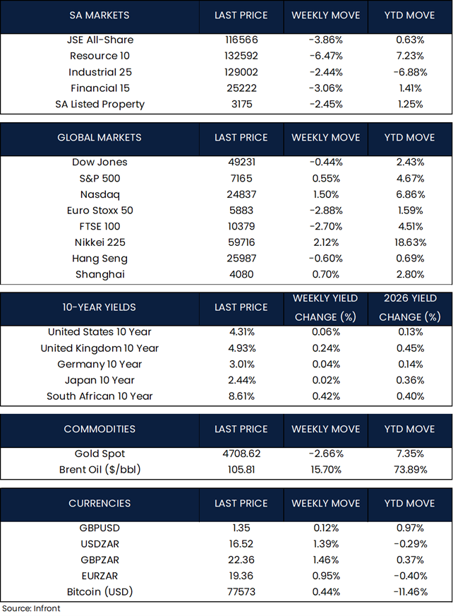 Local equity markets declined over the last week as elevated geopolitical tensions and higher oil prices weighed on sentiment. The JSE All Share Index fell 3.86%, with broad-based weakness across sectors. Resources led the decline, falling 6.47%, followed by Financials (-3.06%), Industrials (-2.44%), and Listed Property (-2.45%). The rand ended the week 1.39% weaker against the U.S. dollar, closing at R16.52 on Friday.